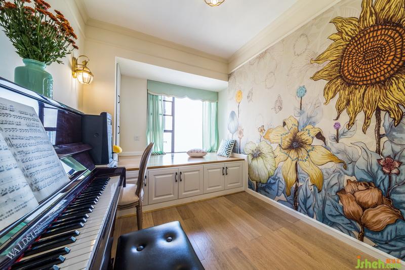 琴房里最吸引眼球的就是那整面墻的向日葵墻紙,明亮的顏色惹人喜愛,琴譜上都是主人細(xì)致描繪的筆記,陽光明媚,微風(fēng)和煦,琴聲悠揚(yáng),教人想按下時(shí)間的暫停鍵,好好享受這一刻的溫馨。