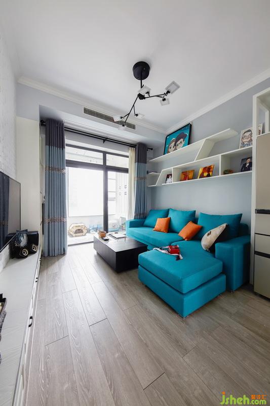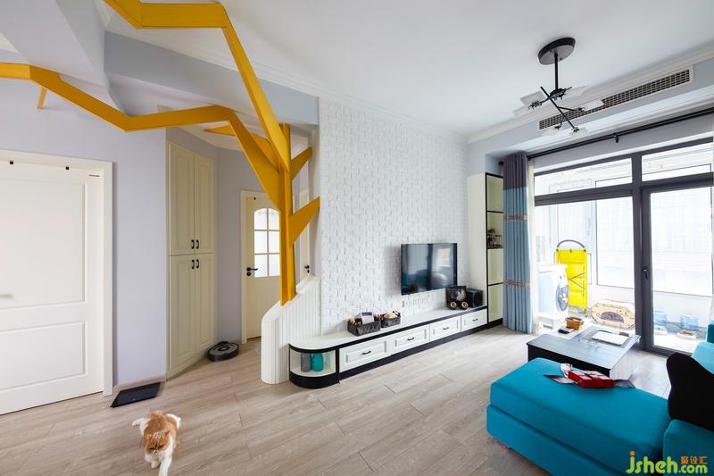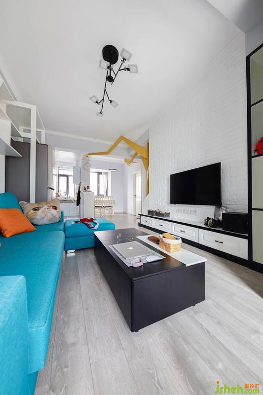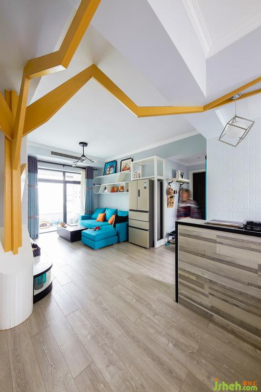 客廳整體的色調(diào)以白色木色為主,用藍(lán)色沙發(fā)跳色,使視覺上更加靈動。由于廚房空間有限雙開門冰箱放在沙發(fā)旁邊正好,冰箱用木工現(xiàn)場制作造型嵌入,沙發(fā)上方采用隔板與冰箱造型相連接形成一個(gè)整體,隔板上可以用來放置業(yè)主好多美美的照片和擺件,讓客廳更加溫馨,當(dāng)然也是加菲玩耍的空間。