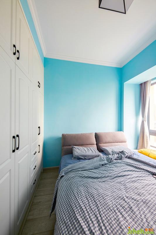 主臥也采用了藍(lán)色乳膠漆,與客廳和谷倉門顏色相互呼應(yīng),簡單舒適飄窗柜既可以儲物也可以作為床頭柜使用