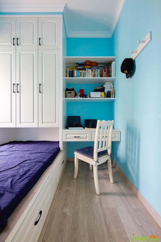 次臥也采用了藍(lán)色乳膠漆,用榻榻米的形式作為目前的書房和以后的兒童房,大衣柜的踢腳鏤空保證床鋪的長度,書桌上方的層板足夠放置書籍和雜物。