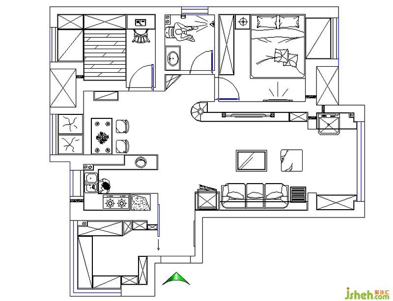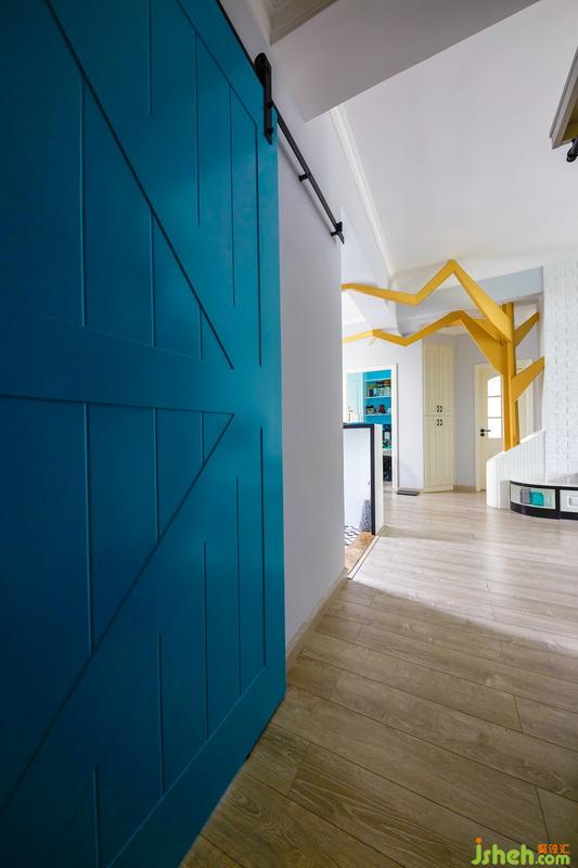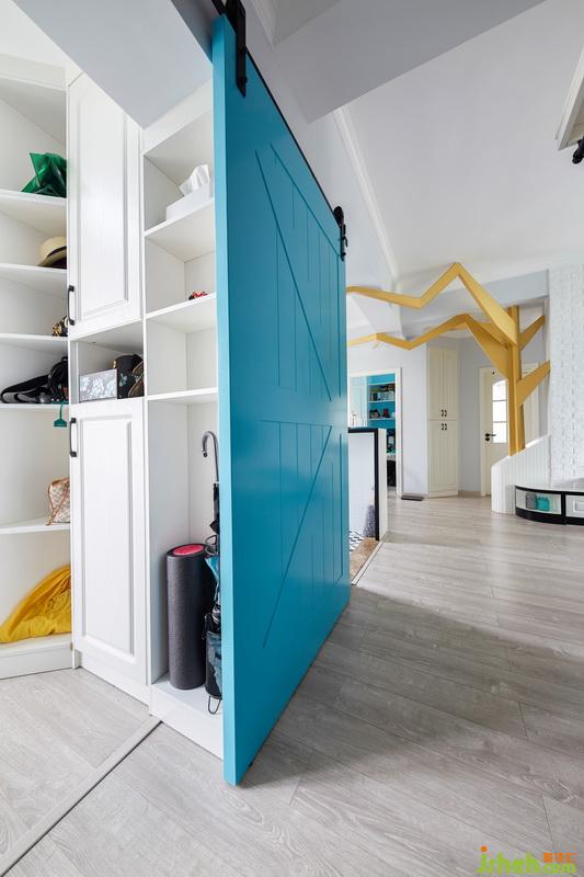 入戶位置房間將鞋柜儲物柜化妝室集合在一體形成一個(gè)多功能室衣帽間,出門梳妝和回家換衣都可以在這個(gè)房間完成,以及包包,傘等出門隨身帶的東西都可以放在衣帽間,衣帽間的門選用谷倉門,顏色用業(yè)主最喜歡的藍(lán)色與玄關(guān)谷倉門和客廳沙發(fā)相呼應(yīng)。