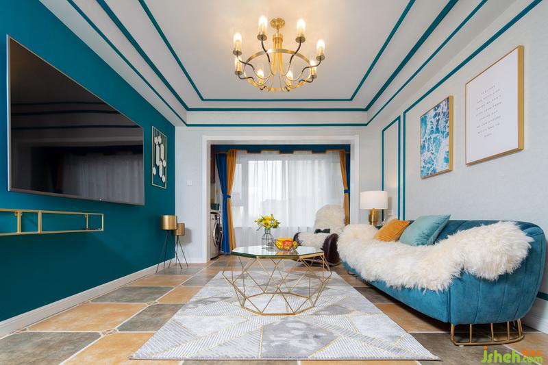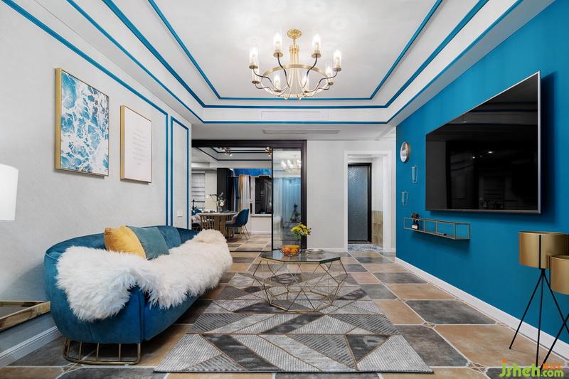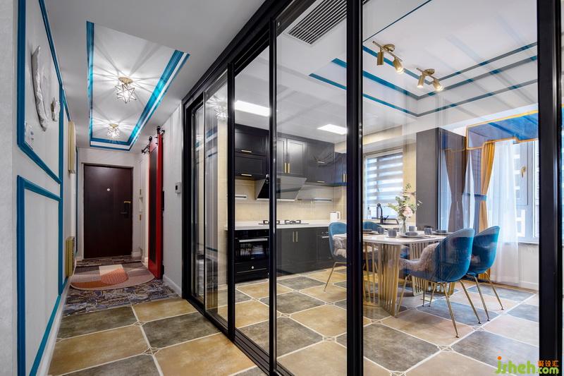 一進(jìn)門,這套作品就已經(jīng)很驚艷惹!藍(lán)色的線條配上燦爛的燈光,流光溢彩間給人一種美的享受,原本過于狹窄的過道,成了藝術(shù)走廊。地面用不同的花磚劃分出區(qū)域,墻面的藍(lán)色線條一直延伸到客廳,將各個(gè)獨(dú)立的空間連貫起來。