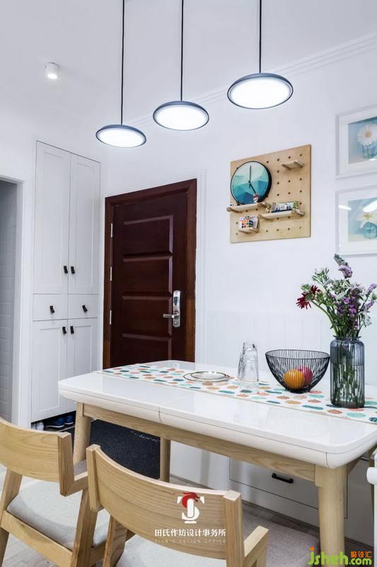 餐廳選用了卡座+凳子的搭配,餐廳面積有限無法安裝柜體,卡座下面的空間就可以得到充分的利用了??ㄗ部梢宰鳛檫M(jìn)門處的換鞋凳,可謂是功能性充分展現(xiàn)。玄關(guān)處到頂?shù)墓耋w也足夠鞋子的儲(chǔ)放。