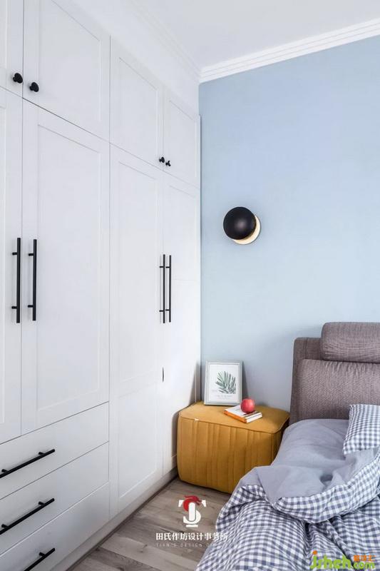 臥室減少了鮮艷色彩的運(yùn)用,使用簡潔風(fēng)格和線條幫助打造輕松入眠環(huán)境,實(shí)木地板溫柔且細(xì)膩,灰色寢具簡潔且禁臟。衣柜也采用白色柜門搭以黑色把手,簡單干練。