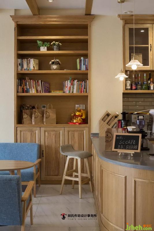 鏈條式的玻璃吊燈星星點(diǎn)點(diǎn)地裝飾著吧臺,室內(nèi)設(shè)計師使用暖黃的燈光烘托出咖啡屋的浪漫氛圍。樺木紋里的內(nèi)嵌式壁柜、暖調(diào)射燈的稱托、店主豐富的書籍積攢,這三元素的交織碰撞又增添了一抹歐美復(fù)古風(fēng)情。