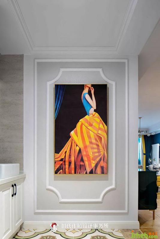 一進(jìn)門,映入眼簾的就是一副巨大的裝飾畫,跳躍的配色給房屋整體藍(lán)白色的主調(diào)增添了一絲活力?;野椎谋尘皦γ嬉餐瑫r(shí)將整幅作品襯托地恰到好處,讓我們一進(jìn)門就有家的氛圍。