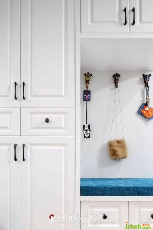 而進(jìn)門的側(cè)邊則有效利用了走廊的空間,在墻面上定制了白色的立柜以及全身鏡,整面的鞋柜有著巨大的收納空間,可以滿足一大家子人的需求。在矮柜的上方放置了深藍(lán)色的絨面軟墊,為平日換鞋提供便利。黑色的柜門把手和白色柜體形成強(qiáng)烈的視覺沖擊,凸顯出濃濃的現(xiàn)代簡約風(fēng)。