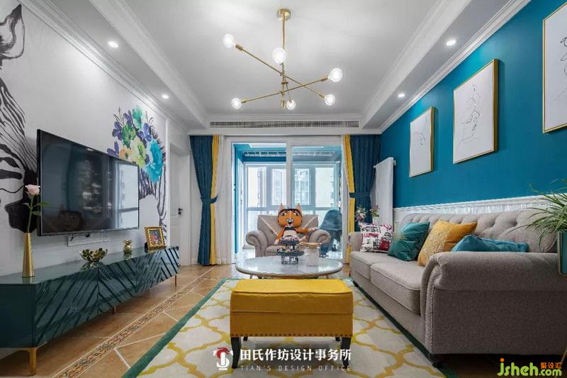黃綠色格紋地毯和藍(lán)黃相間的落地窗簾又打破現(xiàn)代風(fēng)以往的單調(diào),增加了一份濃郁的地中海風(fēng)情。