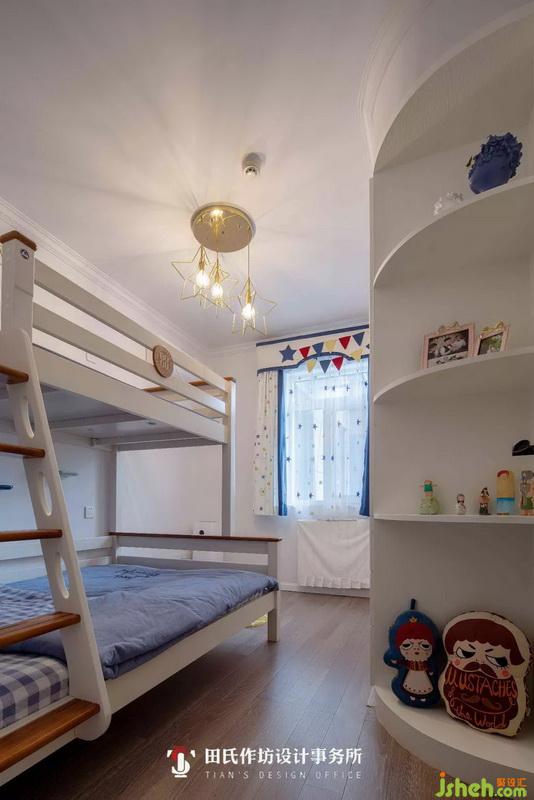 兒童房就比較有趣了,設(shè)計(jì)師采用了高低床,這也為以后小朋友帶伙伴回家過夜做了提前的準(zhǔn)備;金屬星星狀的吊燈和窗簾上的五彩星星呼應(yīng),充滿了童心童趣和活潑的青春氣息。
