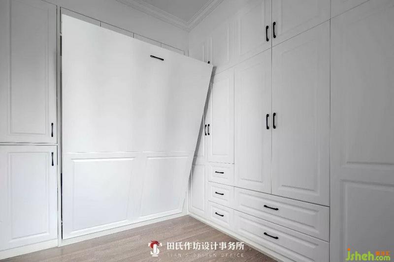 室內(nèi)設(shè)計(jì)師將三房變兩房,主臥與客房做成大套間,衣帽間里面還藏有一張墨菲床,在小孩沒有達(dá)到和父母分房睡的年齡時(shí)就可以使用墨菲床更加方便照顧,整面的衣柜墻又同時(shí)增加了巨大的儲(chǔ)物空間,大小高矮不一的柜子和抽屜也便于業(yè)主做一些分類整理。