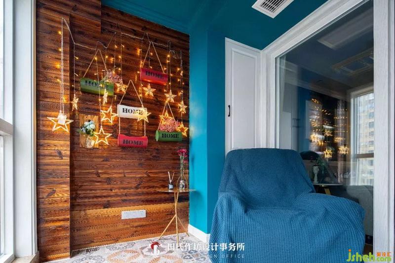 室內(nèi)設(shè)計(jì)師把過長(zhǎng)的客廳分出來五十公分的距離給陽(yáng)臺(tái),這樣陽(yáng)臺(tái)空間就非常舒適了,復(fù)古的有色乳膠漆搭配戶外木讓陽(yáng)臺(tái)整體感覺獨(dú)特舒適,還有強(qiáng)大的儲(chǔ)藏空間,滿墻的星星燈和波西米亞風(fēng)格的地磚又使整個(gè)空間變得明亮了起來;午后能在這樣的陽(yáng)臺(tái)上喝杯咖啡,看本好書,該是多么令人愜意的事情呀~