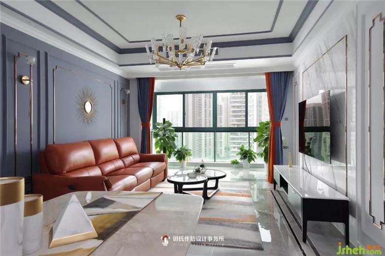 頂面吊頂?shù)幕宜{(lán)色線條與墻面相呼應(yīng),使整個(gè)空間渾然一體,深色的墻面配上橙色的裝飾品和家具,與窗簾相搭配讓家里的顏色相互呼應(yīng),陽臺原本的玻璃門拆掉之后客餐廳空間也更加寬敞明亮。