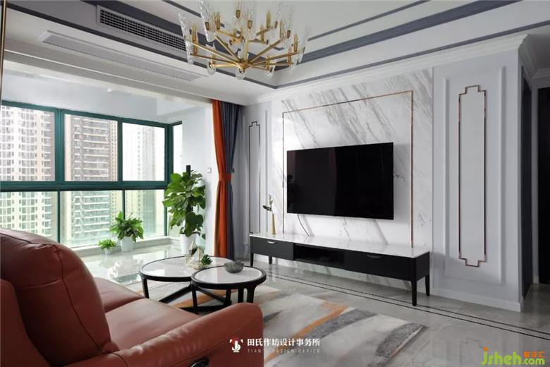 電視機(jī)背景墻則與沙發(fā)背景產(chǎn)生強(qiáng)烈的反差,采用了白色大理石紋路的亮面墻貼,使客廳整體變得更為敞亮。