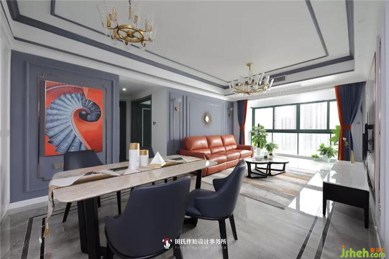 在本案中,設(shè)計(jì)師將客廳和餐廳連接在一起,沒有做任何的隔斷,只用了一塊手工編織地毯便將客餐廳進(jìn)行功能分區(qū),這樣反而使整個(gè)客餐廳顯得大氣、通透。復(fù)古的金屬玻璃吊燈也和客廳的相映成趣。