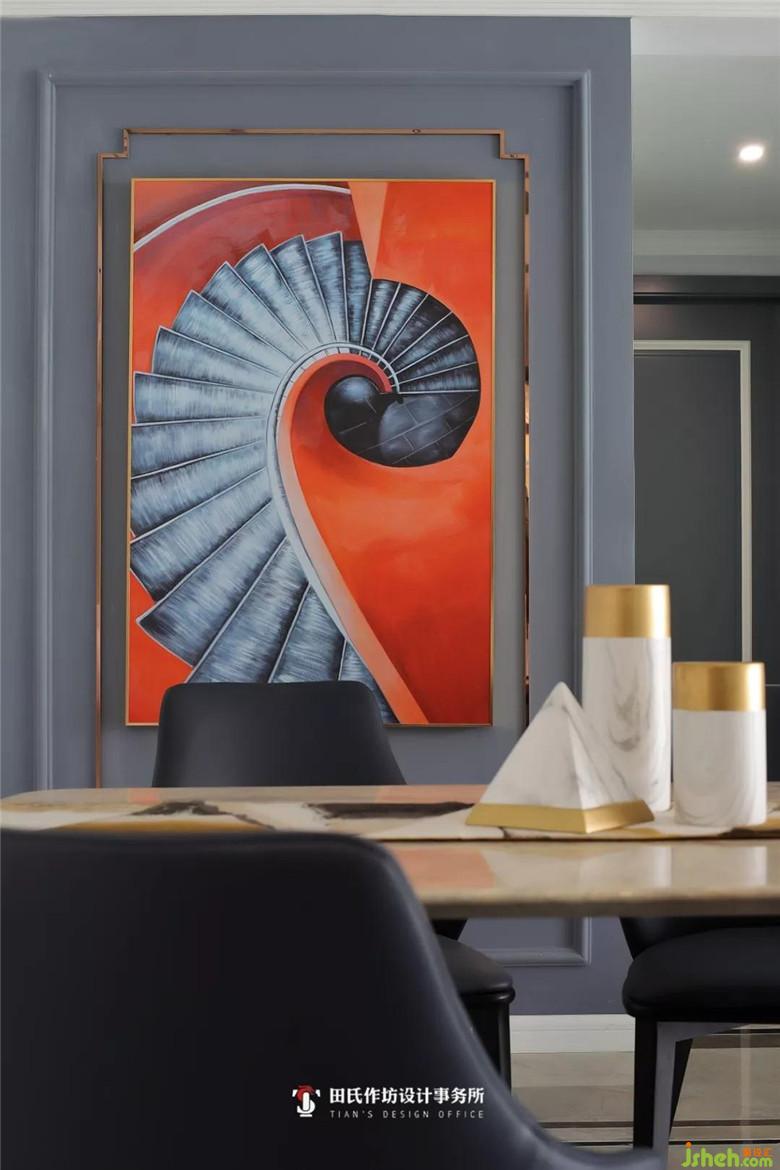 餐廳的背景墻本是和客廳一致采用灰藍(lán)色調(diào),但是室內(nèi)設(shè)計(jì)師精心選擇了巨幅的裝飾畫,大方的曲線、明快跳躍的配色,使得用餐時(shí)業(yè)主的心情也會變得明朗放松。