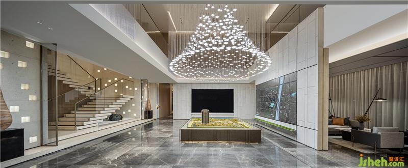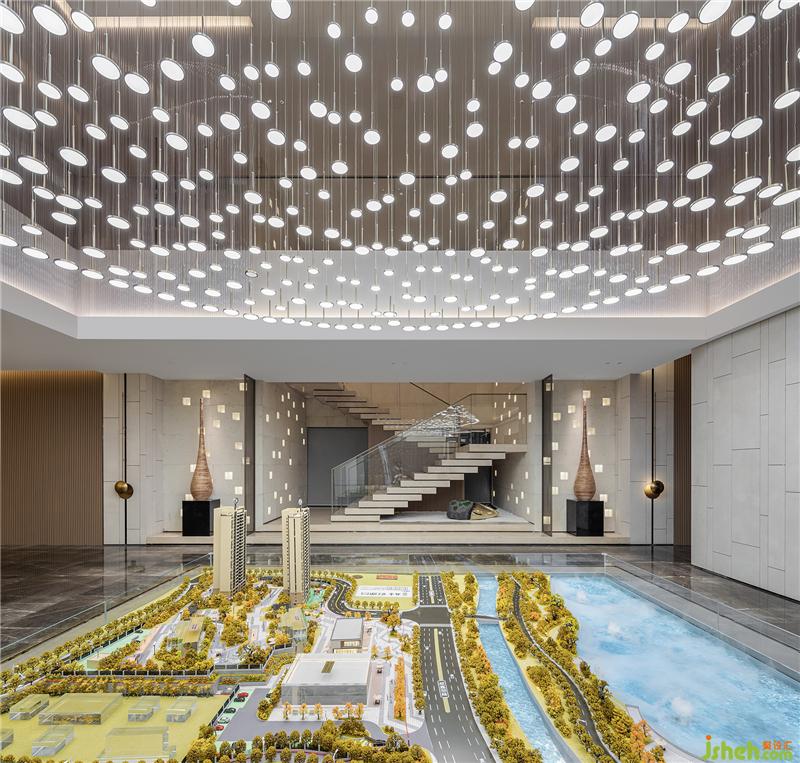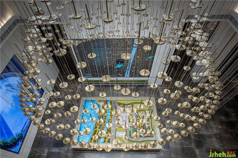 沙盤區(qū)至上而落的藝術(shù)燈具,以“水滴”漣漪在水中變幻形態(tài)為設(shè)計(jì)發(fā)想,輕盈飄逸。整體視覺空間形成聚焦,令觀者留下深刻記憶點(diǎn)。