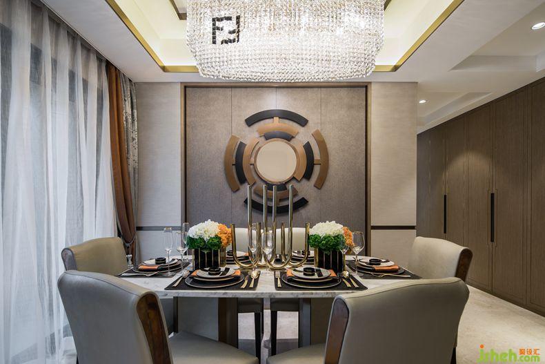 餐廳少了幾分厚重,多了幾分澄澈的香檳色。墻面裝飾鏡拉伸空間層次亦不失其造型感,不同角度的映射讓餐廳充滿活力。