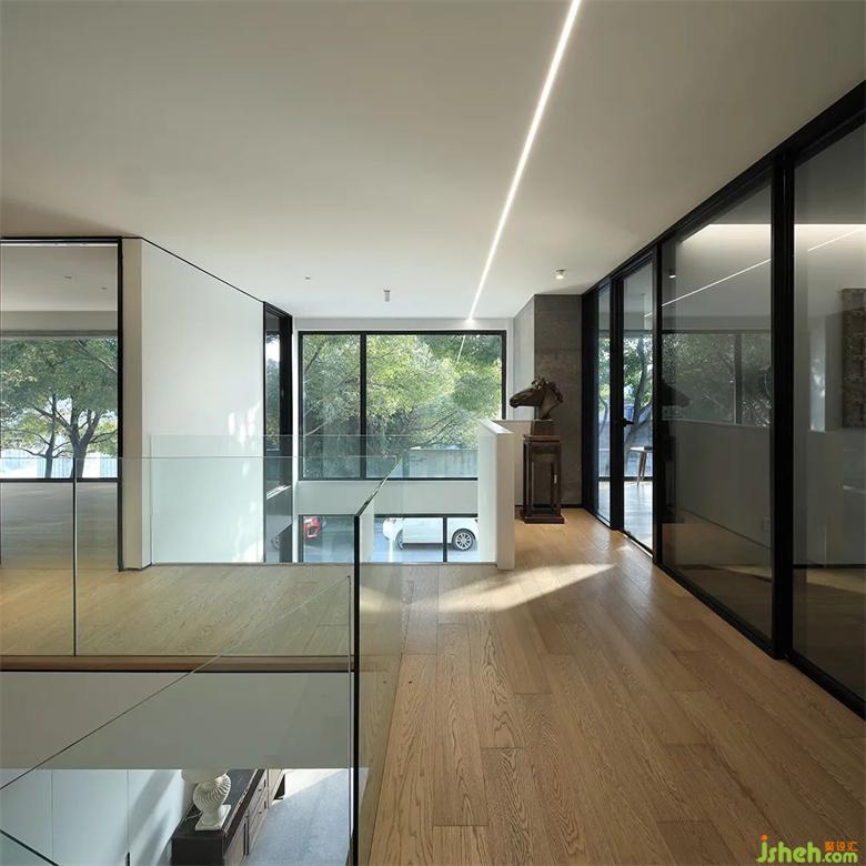 整個空間讓視覺通透性最大化,陽光肆意投入,墻和玻璃倒映著斑駁的樹影,也成了一幅幅畫布,無論人立于何處,都能更多親近自然和陽光,內(nèi)心會充盈平靜。