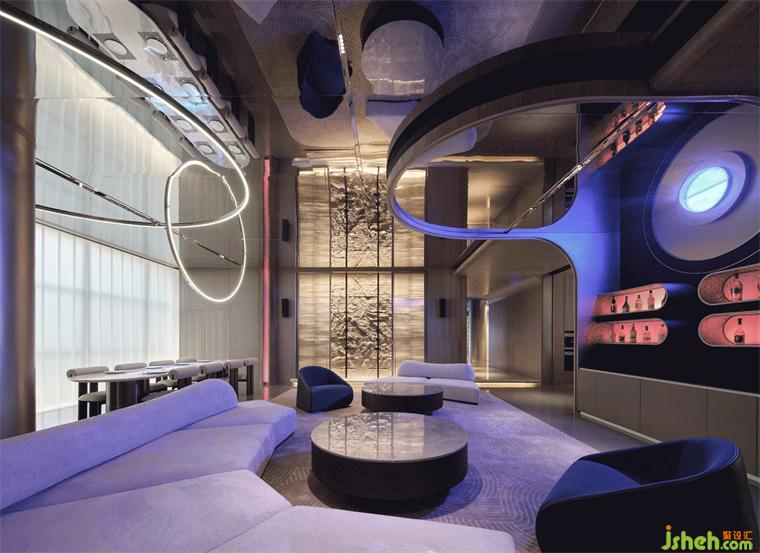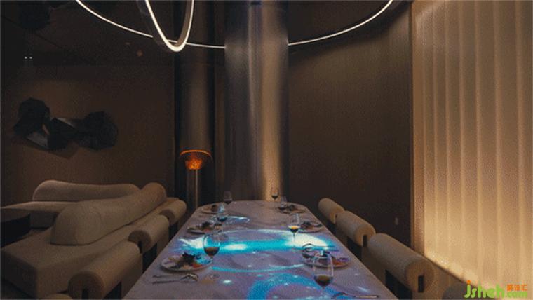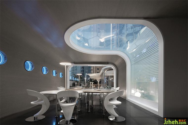 側(cè)面玻璃墻呈現(xiàn)出“天圓地方”的傳統(tǒng)宇宙觀,黑色石材地面,通過(guò)光的反射和投影,營(yíng)造出如同大地的深邃效果。會(huì)所設(shè)計(jì)打破傳統(tǒng)的家具形式,設(shè)計(jì)師以行星散布的形式設(shè)計(jì)了多功能廳的桌面。可移動(dòng)的桌椅如同行星的運(yùn)行,讓空間的功能通過(guò)家具的變化而多變,可會(huì)議、可娛樂(lè),為消費(fèi)者帶來(lái)與眾不同的感受和體驗(yàn)。