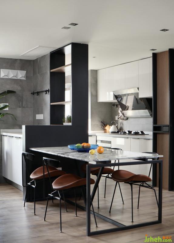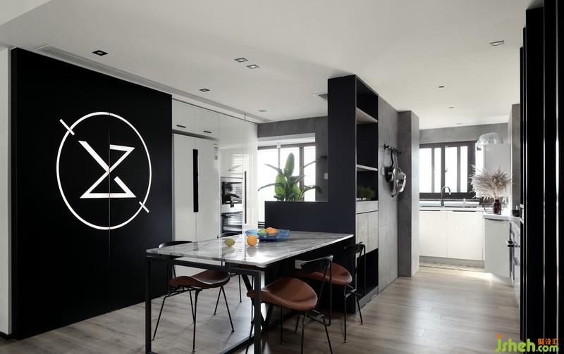 ▲開放式的布局令窗外的綠意美景與光線盡情的穿行室內(nèi),線條利落的大理石餐桌與造型時尚的餐椅,打造出簡約卻不簡單的用餐環(huán)境。不論是煥發(fā)著生機的綠植還是超個性的發(fā)光雕刻鋼板,在這里都被不斷的放大,讓動與靜、明與暗、冷與暖達到平衡。