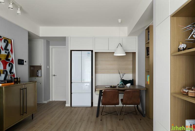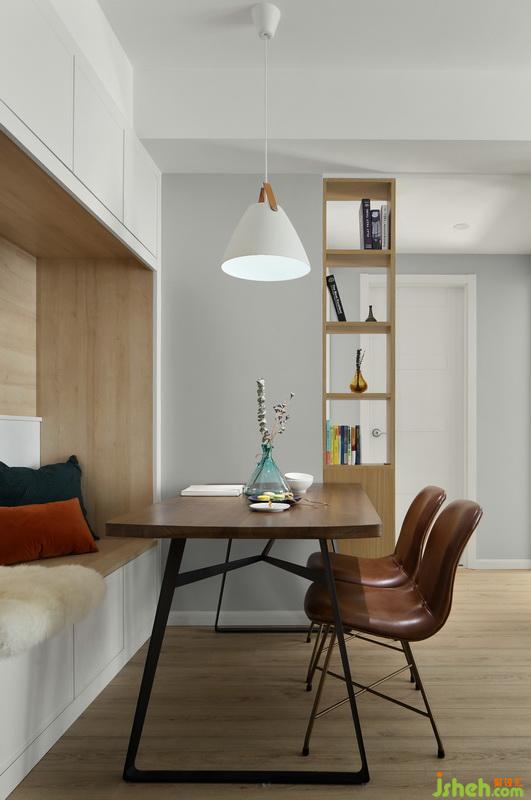 ▲餐廳卡座結(jié)合吊柜及開放陳列柜,室內(nèi)設(shè)計(jì)師將這塊區(qū)域充分利用。由于廚房空間較小,在餐廳將冰箱做嵌入式處理,整個(gè)餐廳嚴(yán)謹(jǐn)有序,卻也輕松悠然。