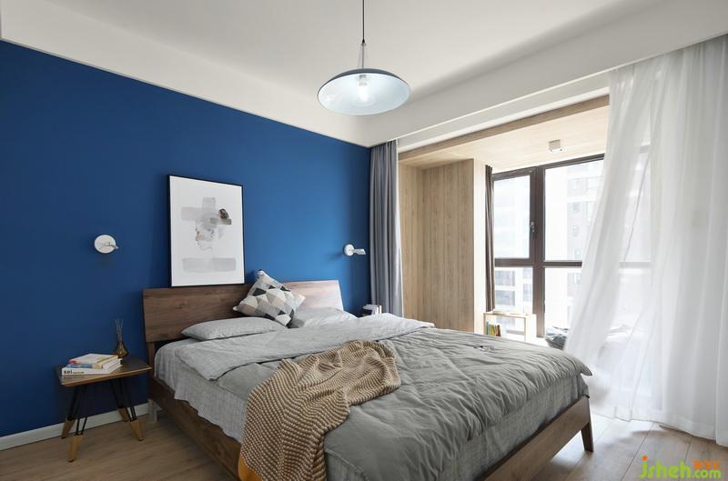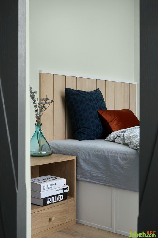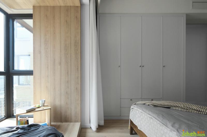 ▲從客廳的淺灰到臥室的深藍(lán),并加入了更多的木質(zhì)元素,以“和而不同”,區(qū)分出空間的獨(dú)立性。室內(nèi)設(shè)計(jì)師為了擴(kuò)大區(qū)域,拆除原飄窗,將木地板延伸到飄窗上,別具一格。