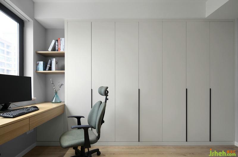 ▲書房+客房做整體性設(shè)計(jì),室內(nèi)設(shè)計(jì)師在有限的格局下,做出奇妙的能力改造。谷倉門可謂是這個(gè)區(qū)域中最匠心妙用的一處設(shè)計(jì)了,打開則是進(jìn)入到客房區(qū)域,閉合狀態(tài)下則是書柜柜門。巧妙的將一個(gè)空間瞬間拆分為兩個(gè)獨(dú)立的房間。