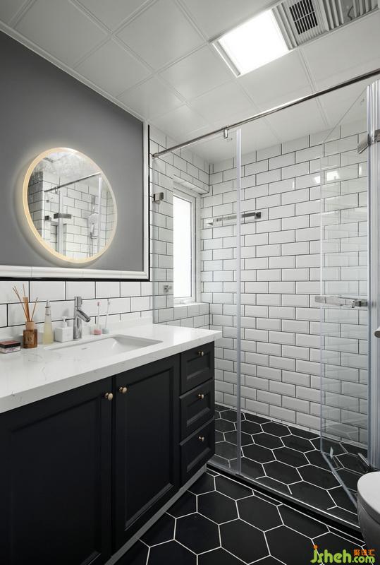 ▲衛(wèi)生間以經(jīng)典的黑白灰色系貫穿空間,浴室柜由熹維S+定制,黑色啞光烤漆柜門搭配黃銅拉手,即便是素色空間,也可以交織出豐富的視覺效果。