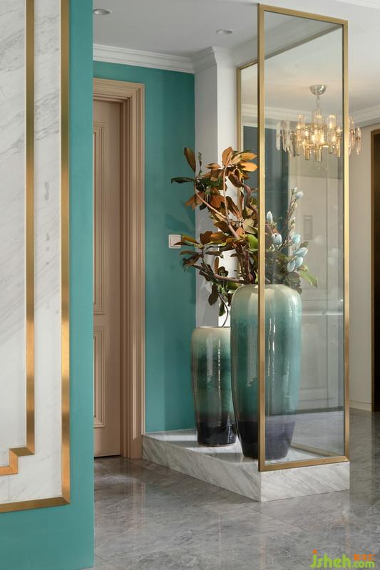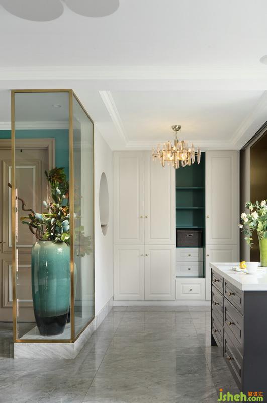 ▲優(yōu)雅的藍(lán)綠色調(diào)首先從視覺上便抓住了我們的視線,給空間一個基色。門廳處的景觀隔斷設(shè)計以金色不銹鋼+玻璃結(jié)合大理石地臺做的一個通透設(shè)計,其實也是為了避免進(jìn)入門廳后看到盥洗區(qū)域,通過隔斷來轉(zhuǎn)移我們的視線,弱化這塊區(qū)域。入戶右側(cè)的鞋帽柜為定制設(shè)計,局部的開放柜延伸了藍(lán)綠色調(diào),而景觀花瓶的漸變色也與基色互相搭配。對于清新而不媚俗的藍(lán)綠總能引發(fā)我們對生活的無限遐想,自然而唯美。