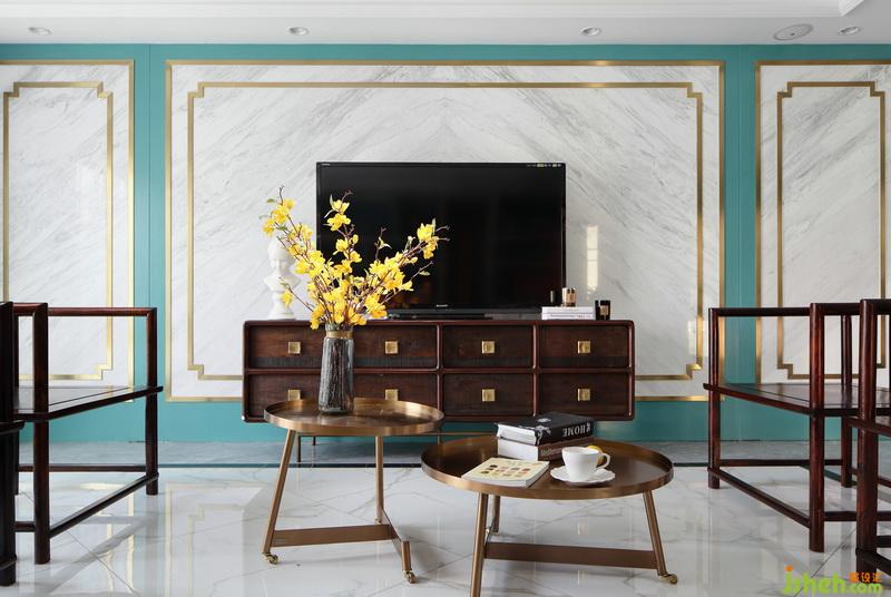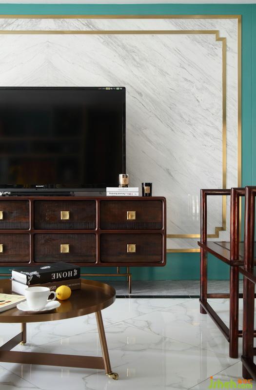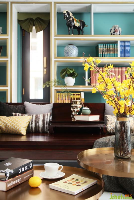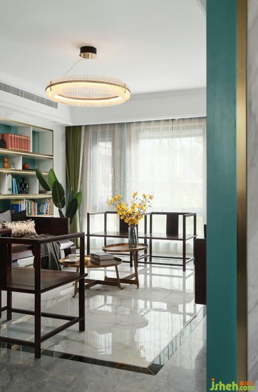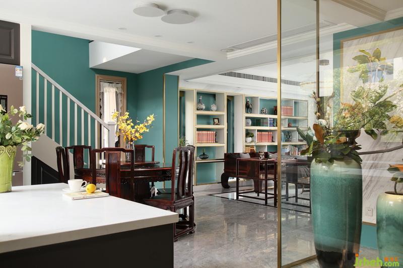 ▲從門廳向客餐廳望去,紅木家具是空間中濃墨重彩的所在,卻恰到好處的壓住整個空間。電視背景墻以藍(lán)綠基色為底,運用大理石+不銹鋼邊條劃分背景區(qū)域,這樣的搭配輕松營造出華麗與質(zhì)感。沙發(fā)后面結(jié)合小窗戶做了整面開放展示書柜,這樣的鏤空設(shè)計結(jié)合清新的藍(lán)綠色調(diào),減輕了家具帶來的厚重感,打造會呼吸的空間。