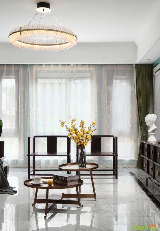 ▲室內(nèi)設(shè)計師將空間中的紅木家具的新中式元素運用則彰顯出“舊時”的優(yōu)雅與奢華,適當(dāng)?shù)谋A粢脖苊饬嗽斐筛】涞囊曈X印象。同時加入了現(xiàn)代時髦的黃銅元素的組合茶幾,這些頗具腔調(diào)感的家具將室內(nèi)的華麗感提升而又互相融合,自成一派。
