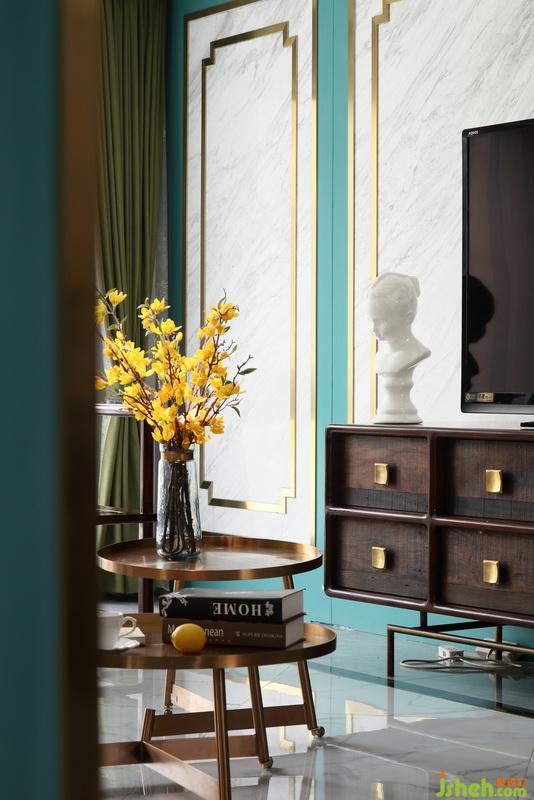 ▲新中式風(fēng)格的簡(jiǎn)約線條型電視柜及座椅,與空間中許多的線條裝飾也達(dá)到了一種奇妙的搭配??蛷d的大面積的玻璃窗,隔著紗簾透進(jìn)來的陽(yáng)光,朦朧而唯美,不論是裝飾品還是鮮花的點(diǎn)綴,都讓這里增添了生動(dòng)的藝術(shù)氣息。