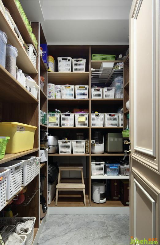 ▲收納間以轉(zhuǎn)折的儲(chǔ)物架來最大化滿足這個(gè)區(qū)域的使用功能性,其中層板的分配可以根據(jù)具體物品的擺放來規(guī)劃。