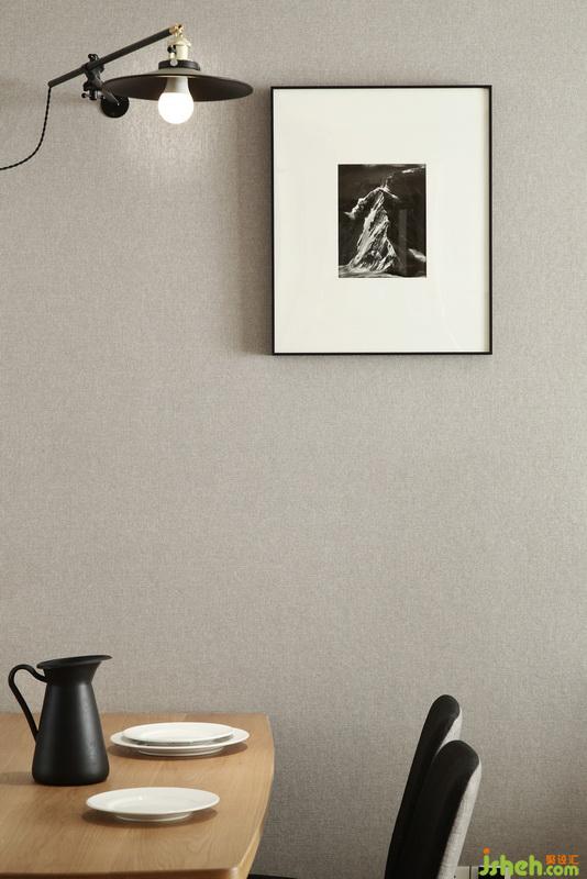 ▲餐廳區(qū)域墻上的裝飾畫不僅提升了空間的氣質(zhì),同時隱蔽了電箱。以溫潤的木質(zhì)餐桌椅搭配優(yōu)雅的灰色調(diào)墻面,營造出柔和安寧的空間氛圍。