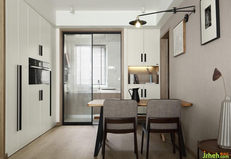 ▲迎面玄關(guān)的是定制的西廚高柜,用于嵌入式電器外也是收納儲物的好地方。為了符合生活需求,入戶處增加了鞋柜設(shè)計,鞋柜中間做開放設(shè)計也是為了避免柜體過于厚重,使入戶看起來擁堵,也可作為平時隨手放小物件的區(qū)域。廚房區(qū)域與餐廳區(qū)域息息相關(guān),而廚房移門的加入便使餐廳具有光亮通透感,同時開闊了廚房空間。
