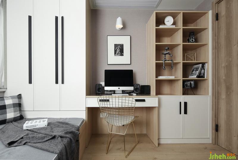 ▲書房區(qū)域,在并不寬敞的空間內(nèi),室內(nèi)設(shè)計師通過定制的家具滿足功能及儲物需求,將榻榻米、衣柜和書桌及書柜做了一體化結(jié)合設(shè)計,即便是素色空間,卻能讓人感受到溫暖而舒適的愜意生活。