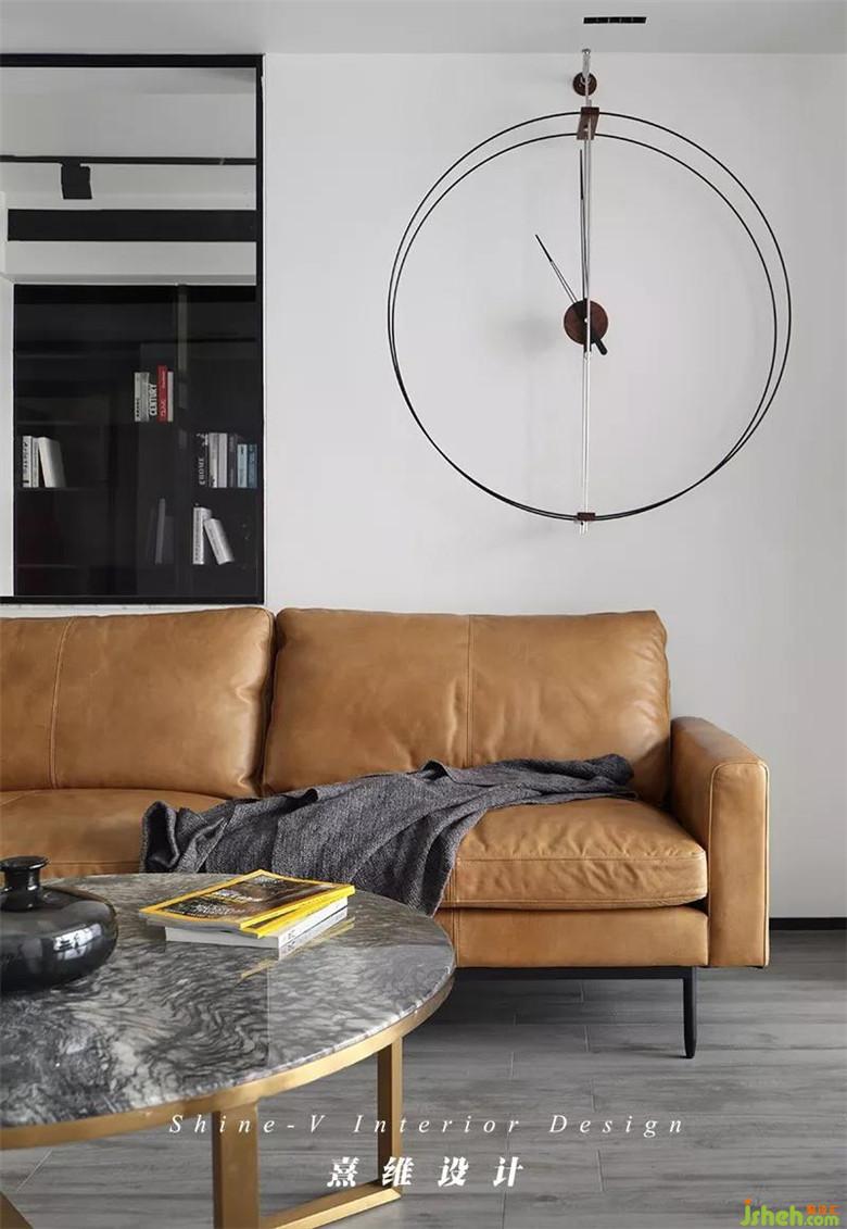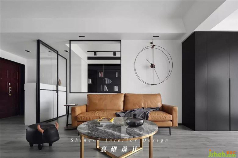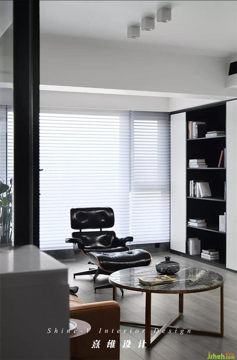 ▲以黑白灰色為空間基調(diào)——入戶便能感受到整個空間濃郁的簡約現(xiàn)代風,其中沙發(fā)作為客廳中的主體家具,以暖色調(diào)棕色進行點綴、中和。沙發(fā)后便是書房,室內(nèi)設(shè)計師通過玻璃隔斷的處理方法保證了室內(nèi)的采光,光線的暈染下,家具更有質(zhì)感,織品更加舒適,黑色與棕色也避免了沉悶。
