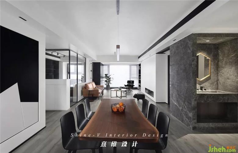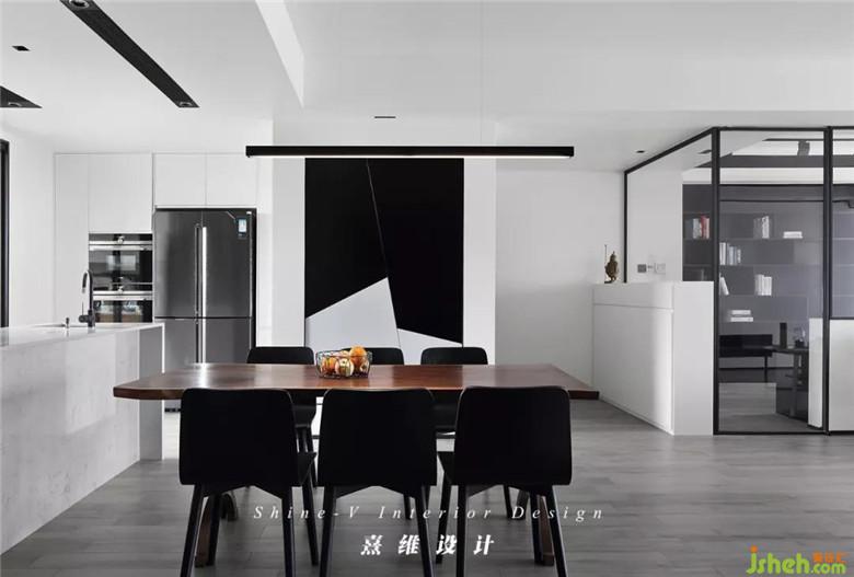 ▲以開放式的布局讓餐廳同樣可以享受到充沛的光線,使這片場(chǎng)域的視野也開闊起來。室內(nèi)設(shè)計(jì)師用幾何圖形肆意的規(guī)劃餐廳背景墻,賦予空間變化,間富有層次。當(dāng)然這面背景墻不僅僅是裝飾,也是用于電箱的遮蔽和儲(chǔ)物。