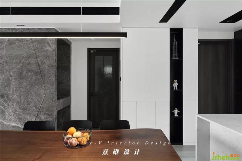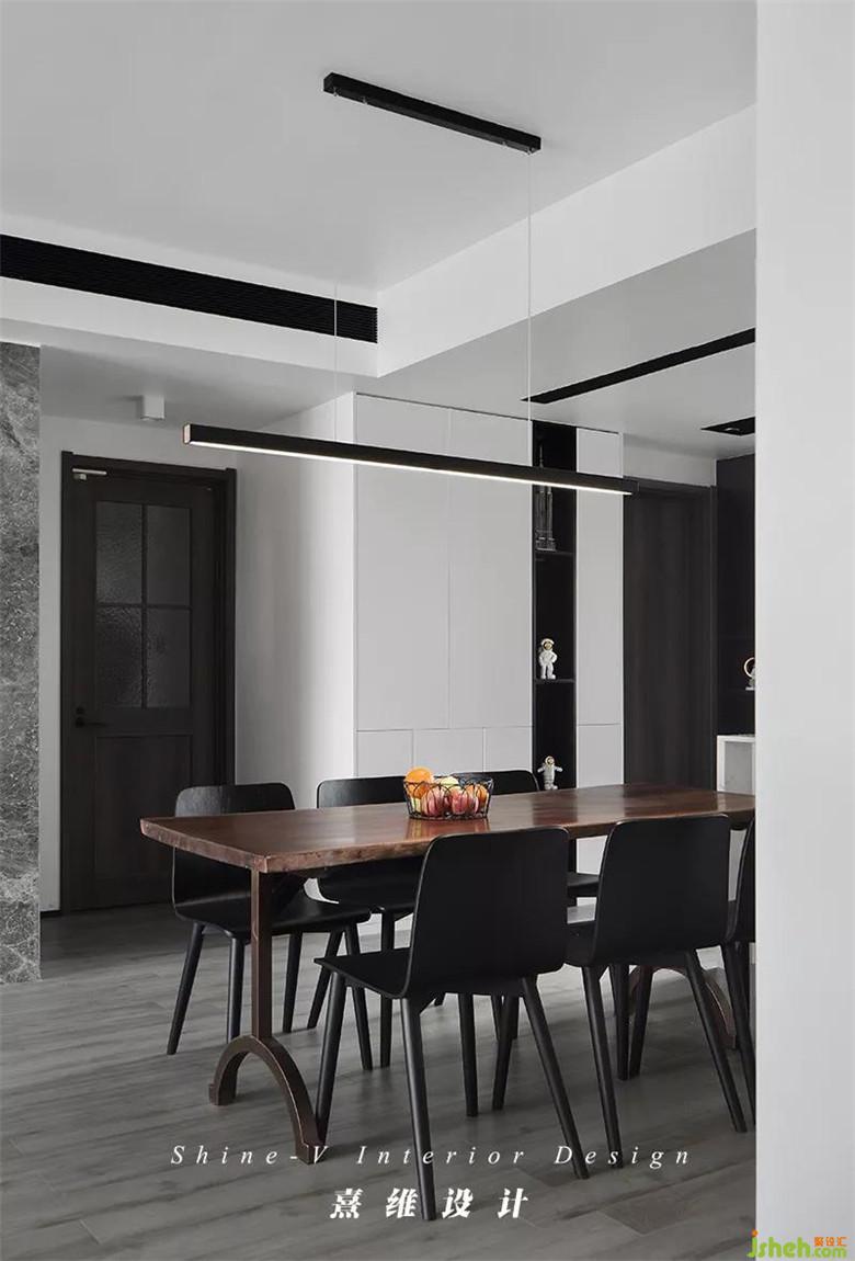 ▲西廚區(qū)在黑白灰主色調的基礎上柔和了木色,讓整個空間調和的更具溫度。黑色的加長風口和嵌入式射燈也讓空間頂面設計更加出彩,燈光與整體空間的氛圍營造密不可分!