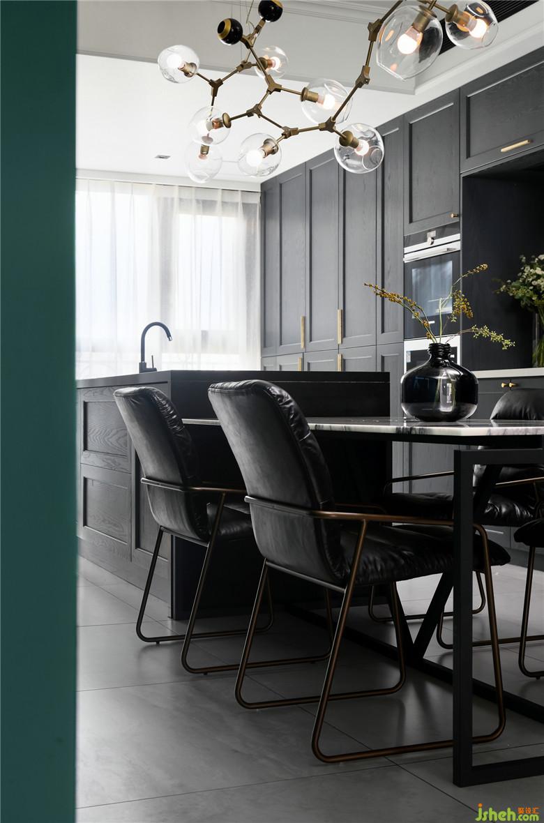 餐廳比較長,nordst的大理石餐桌和全屋的石材質(zhì)感墻磚相匹配。加長的分子吊燈從視覺上延伸了餐廳的空間。
