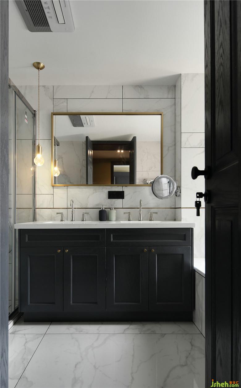 客衛(wèi)的干區(qū),做了臺盆干濕分離的設(shè)計,配色上采用大面積深色仿石材瓷磚搭配金色元素,延續(xù)了整屋的深灰色元素。全屋的門套線均是做到頂,視覺上拉升了房屋的高度。整體灰色調(diào)搭配金色點綴,增加了一份寧靜和優(yōu)雅!室內(nèi)設(shè)計師