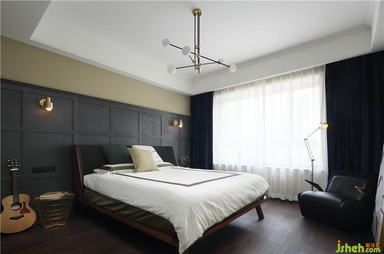 主臥的背景墻設(shè)計依舊延續(xù)了客餐廳的灰色設(shè)計元素,使用高位的護(hù)墻板以達(dá)成整體的風(fēng)格統(tǒng)一性,深色的窗簾可以增加睡眠的舒適度。角落的單人沙發(fā)搭配宜家的落地?zé)簦蔀榱宋葜髯類鄣拈喿x角。