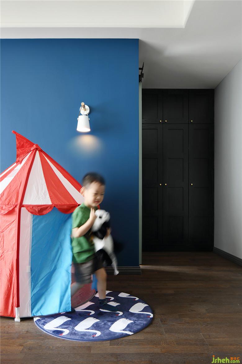 兒童房的設(shè)計盡可能多的給予孩子活動空間,并增加了一個小的衛(wèi)生間,對于大戶型來說更加方便孩子使用。配色上使用深藍色,黑色和湖藍色增加視覺效果,體現(xiàn)兒童房的活潑性。