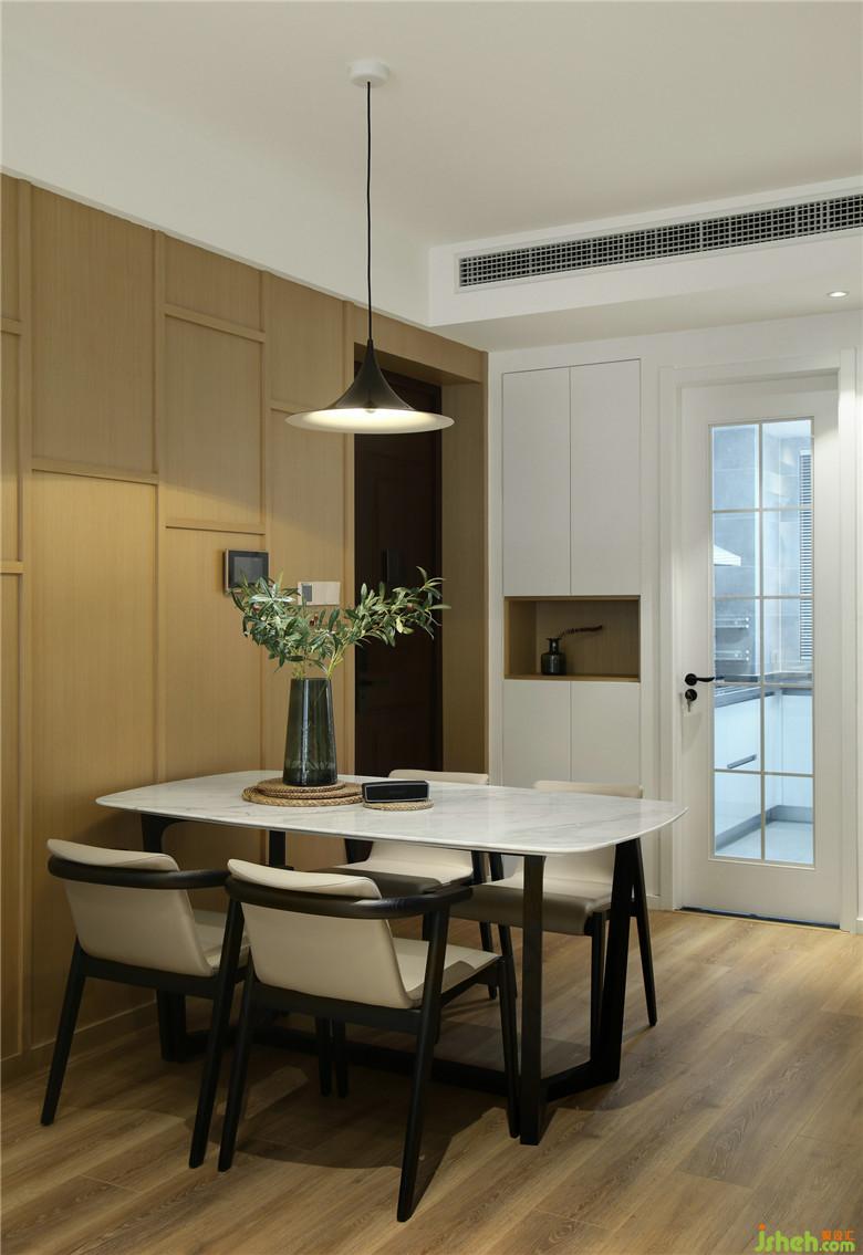 ▲餐廳區(qū)域以定制的木質(zhì)造型墻作為這片區(qū)域的裝飾和起到劃分功能區(qū)的作用,木元素的運用貫穿室內(nèi)。室內(nèi)設(shè)計師精心挑選的裝飾畫,木質(zhì)溫潤的餐椅,質(zhì)感優(yōu)雅的大理石餐桌,每件單品的選擇都是想為家增加一抹藝術(shù)氣息。