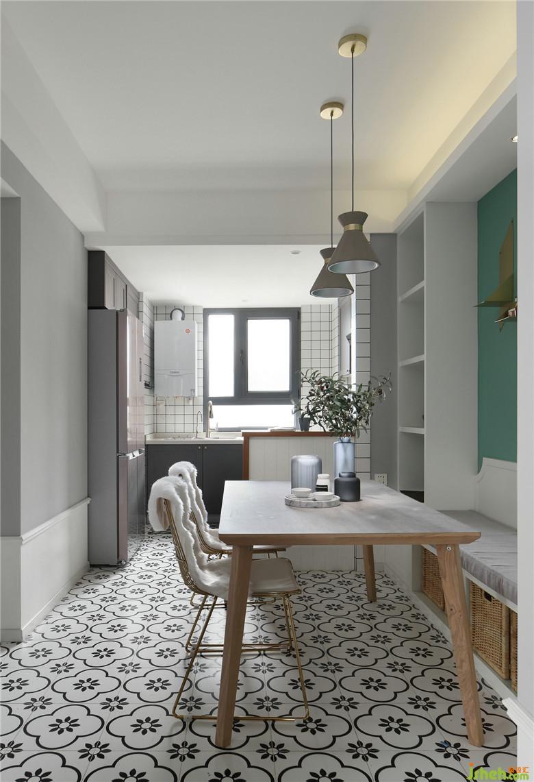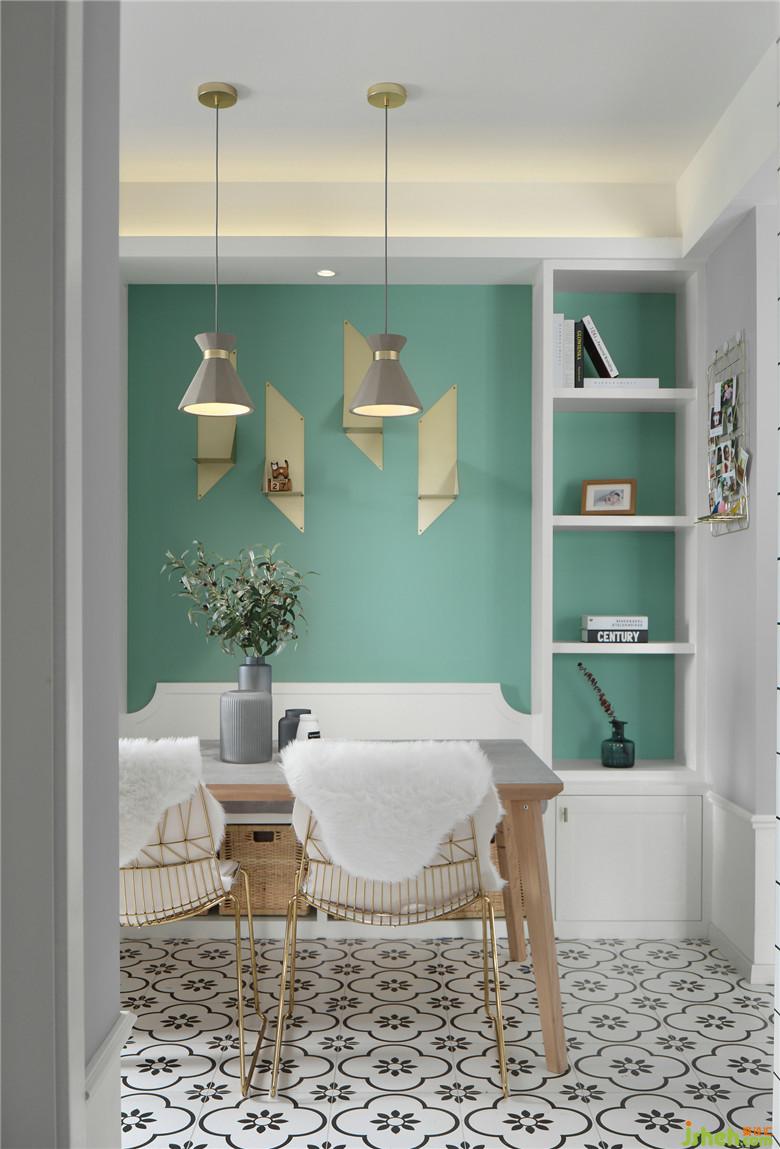 ▲餐廳背景墻室內(nèi)設(shè)計師依舊選用了屋主中意的綠元素,在白色定制卡座的映襯下,讓這片區(qū)域顯得更加清爽,帶給視覺極大地舒緩。開放式的布局讓餐廳和廚房更加通透明亮,各個功能區(qū)的聯(lián)系也顯得更加緊密。
