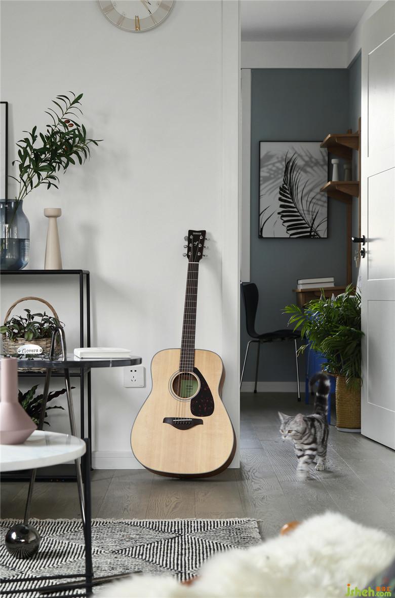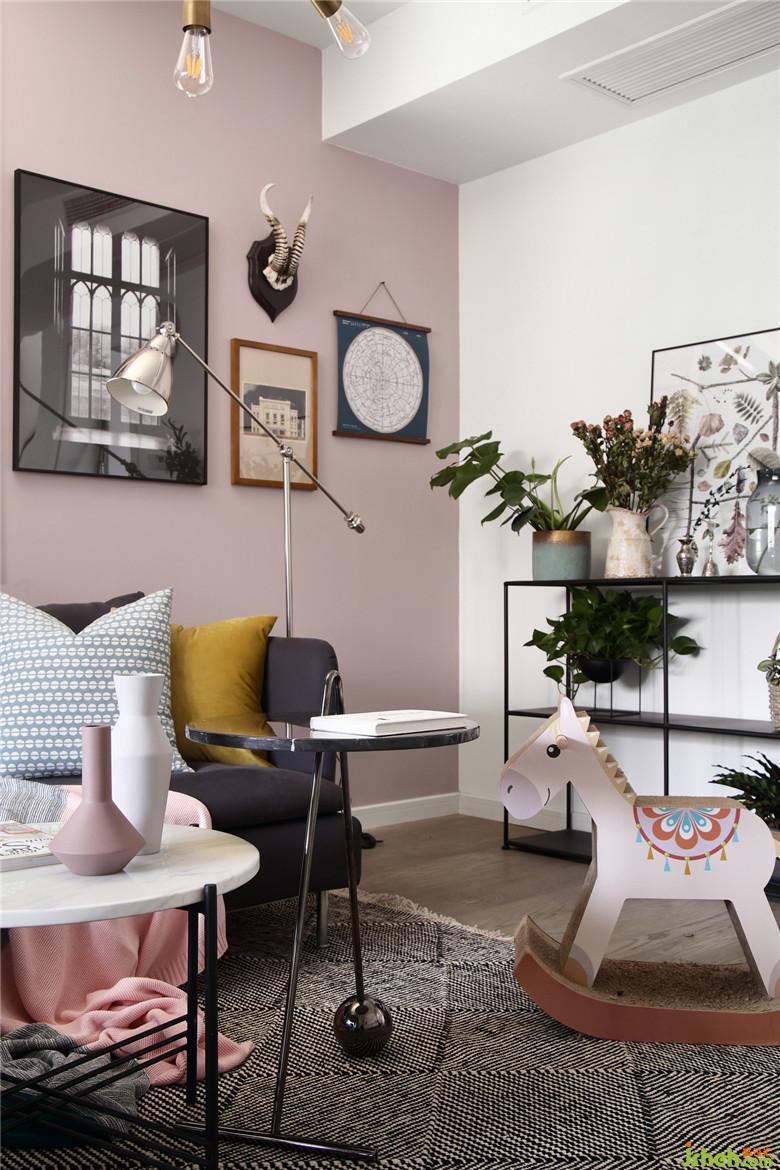▲在這個面積并不開闊的空間里,室內(nèi)設(shè)計(jì)師將不同的元素進(jìn)行著比對,而黑色金屬線條的置物架,不僅滿足了展示收納功能,也不顯得空間擁擠,恰到好處的交織出奇妙的平衡感。屋主夫婦的內(nèi)心一定是柔軟而充滿童趣的,粉色木馬仿佛回到了童年,彈著木吉他,有一只他和她的貓。