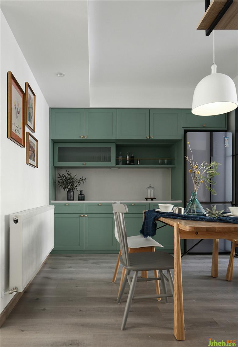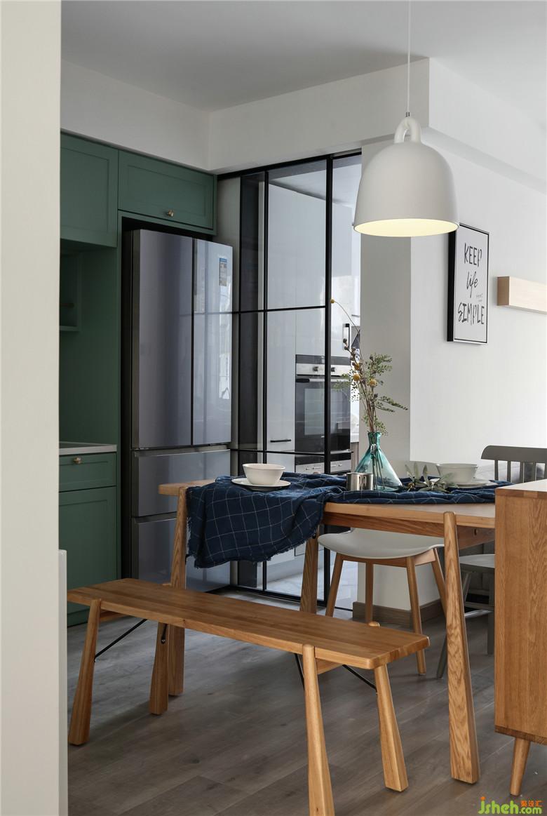 ▲對(duì)于餐廳的位置確定是本案設(shè)計(jì)的關(guān)鍵之處,室內(nèi)設(shè)計(jì)師考慮到餐邊柜及暖氣片的位置擺放,還要避免正對(duì)廚房門,如果僅靠廚房一側(cè)擺放,不僅進(jìn)出不便,也浪費(fèi)了中間的過(guò)道空間。最終將餐廳確定在了這片區(qū)域中間的一個(gè)位置,行走動(dòng)線順暢的同時(shí)也充分利用了空間,暖氣片及餐邊柜也有了合理的規(guī)劃。