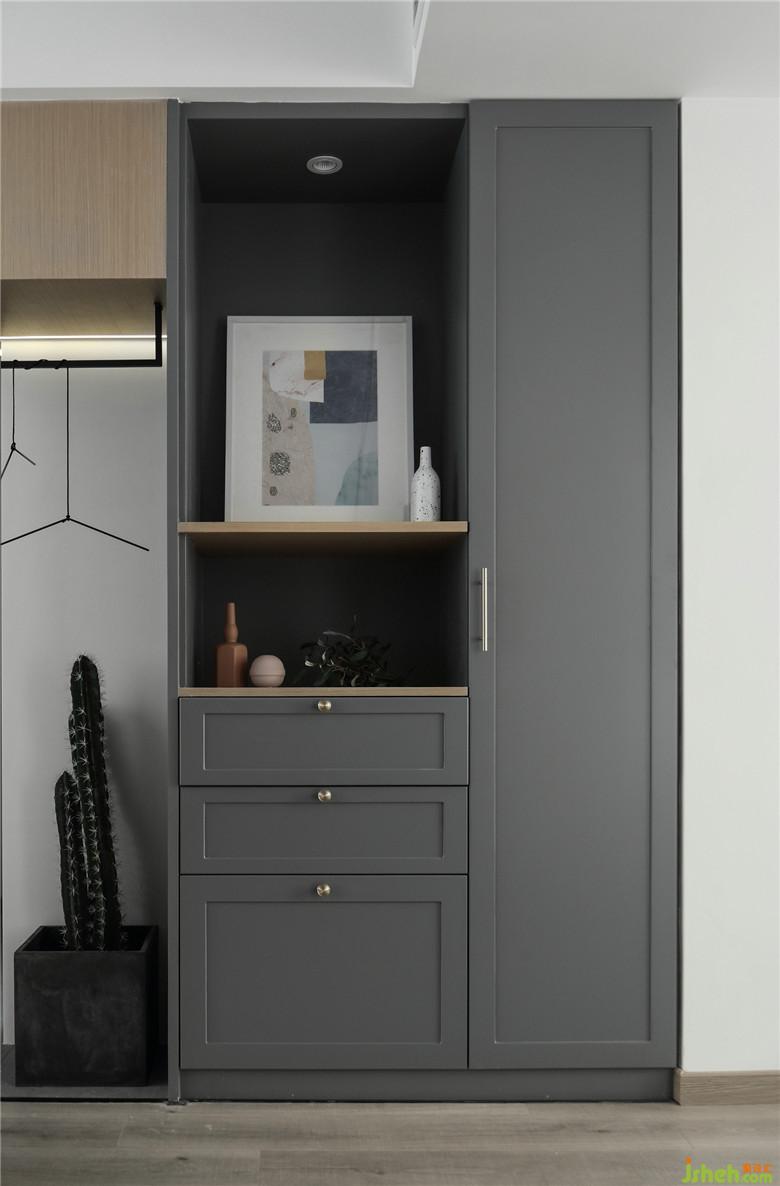 ▲從餐廳處看向入戶玄關(guān),淺灰色的收納柜與入戶鞋帽柜呼應(yīng)設(shè)計(jì),半開放式的布局也是家中進(jìn)行展示的巧妙位置。原本柜體這塊有部分隔墻,造成了從入戶看向客餐廳阻擋視線的弊端,而室內(nèi)設(shè)計(jì)師將隔墻打掉,同時(shí)為了擴(kuò)大主衛(wèi)空間,將主衛(wèi)墻體向外推,最終留出收納柜的深度。收納柜頂部的木色塊體底部?jī)?nèi)嵌了燈管,下方設(shè)置了一個(gè)置衣架,這樣不僅使空間通透不阻擋視線,也方便于回家后外套的放置。