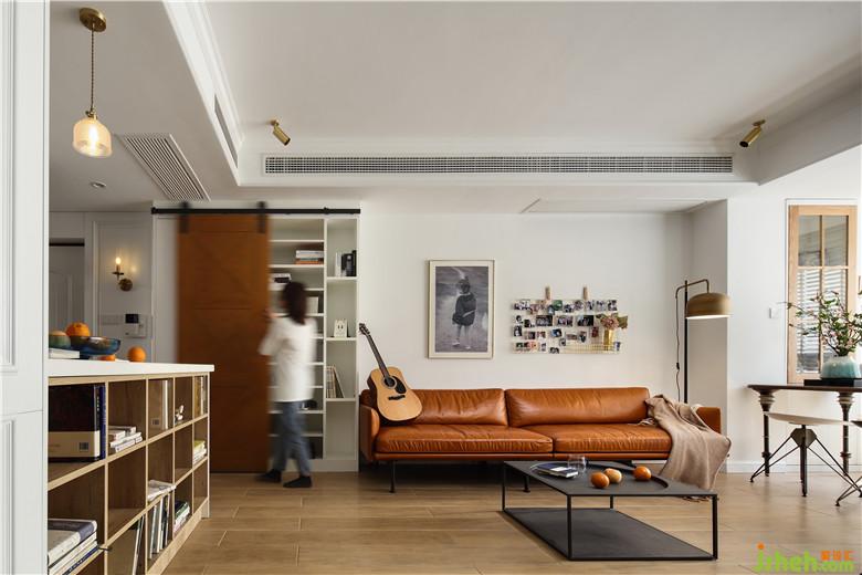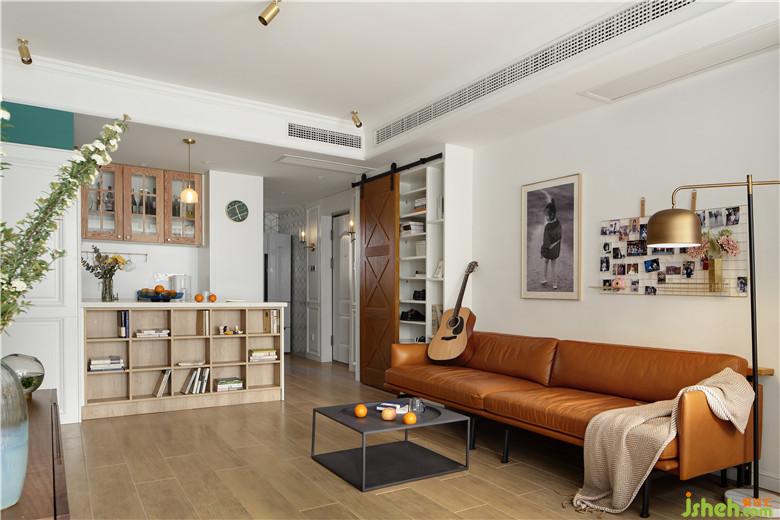 ▲室內(nèi)設(shè)計(jì)師在材質(zhì)、顏色搭配或是功能區(qū)布局上,以靈動(dòng)、多用途進(jìn)行規(guī)劃。客廳部分的收納空間采用了半開(kāi)放式谷倉(cāng)門(mén)的形式,半開(kāi)放式的設(shè)計(jì)半藏半露,凸顯了生活趣味感,谷倉(cāng)門(mén)的利用,帶來(lái)了美式鄉(xiāng)村的氣息也為客廳空間添加了個(gè)性特色。