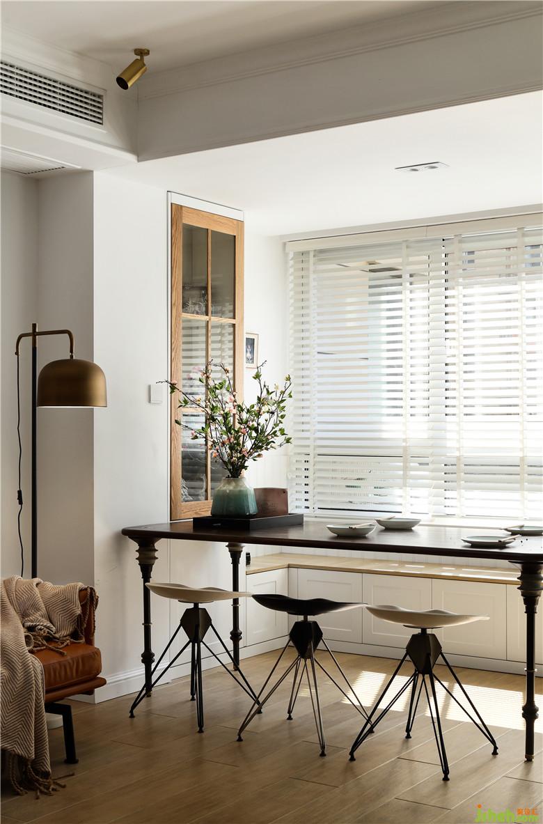▲室內(nèi)設(shè)計(jì)師將原本客廳陽(yáng)臺(tái)的區(qū)域打通改造成用餐區(qū),利用陽(yáng)臺(tái)外墻抽槽鋪設(shè)靠背板,增添帶了收納功能的卡座。使客餐廳部分的視覺(jué)效果更加統(tǒng)一,房屋的功能分區(qū)更加合理。一面綠墻點(diǎn)綴,其他墻面皆為白色,點(diǎn)綴上蜜糖色的沙發(fā),木色柜組,給空間染上了淡淡的復(fù)古感。